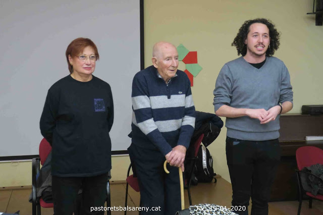 Fotos: Mn. Joan fent el paper de Simeó (any 2017). Mn. Joan amb Ramon Folch i Camarasa, en l’acte commemoratiu del Centenari dels Pastorets de Folch i Torres (2016). Cloenda després de l’última representació de la temporada passada (19 de gener de 2020).